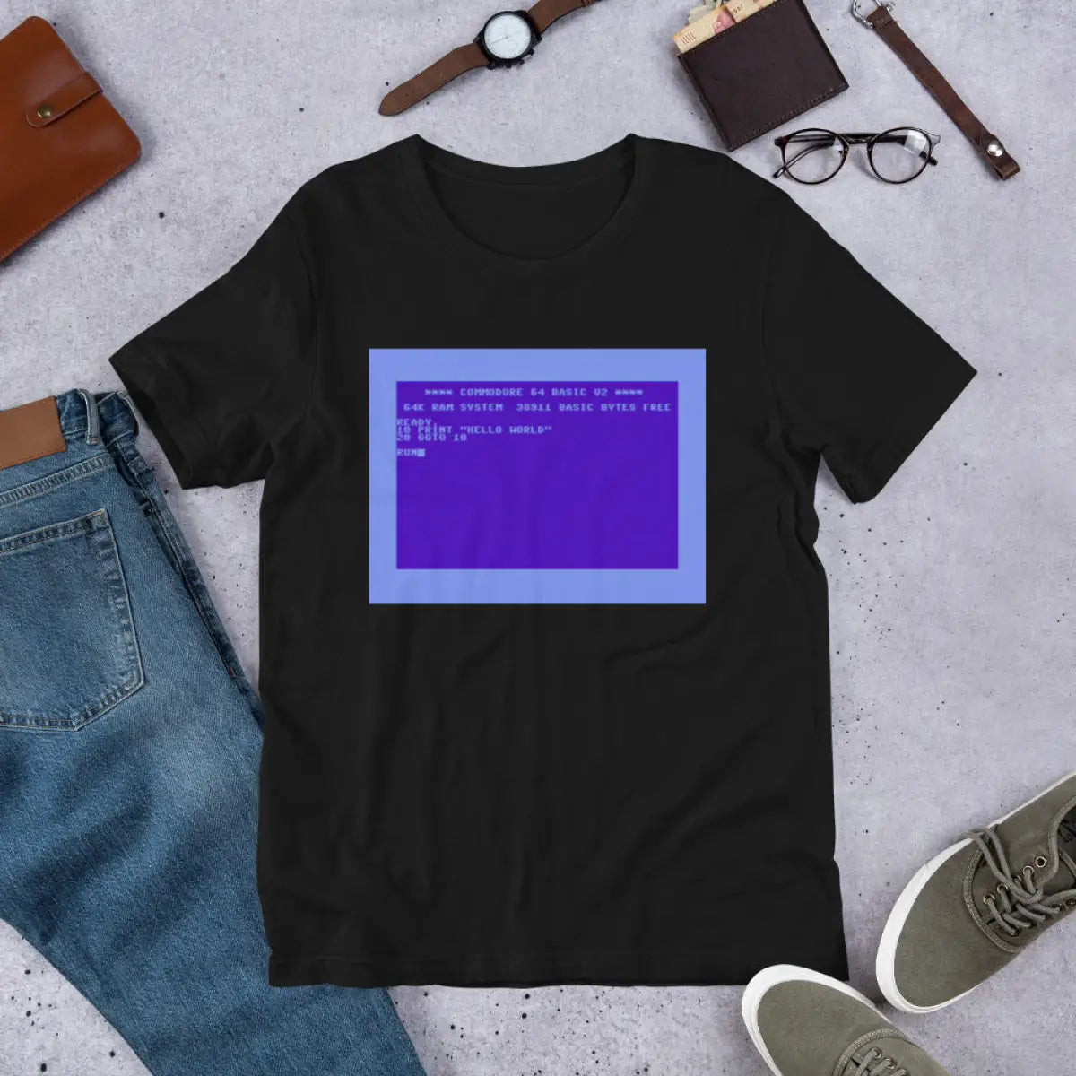 Celebrate a nostalgic slice of computing history with our Commodore 64 Hello World Tshirt. Perfect for tech enthusiasts and retro computing fans, this unisex tee features a classic Commodore 64 screen displaying the iconic 'Hello World' code snippet. Made from soft, durable fabric, it's designed for comfort and style, offering a relaxed fit for all body types. Whether you're coding at home, attending a tech event, or just out and about, this shirt is sure to spark conversations and showcase your geeky pride for old-school computing!