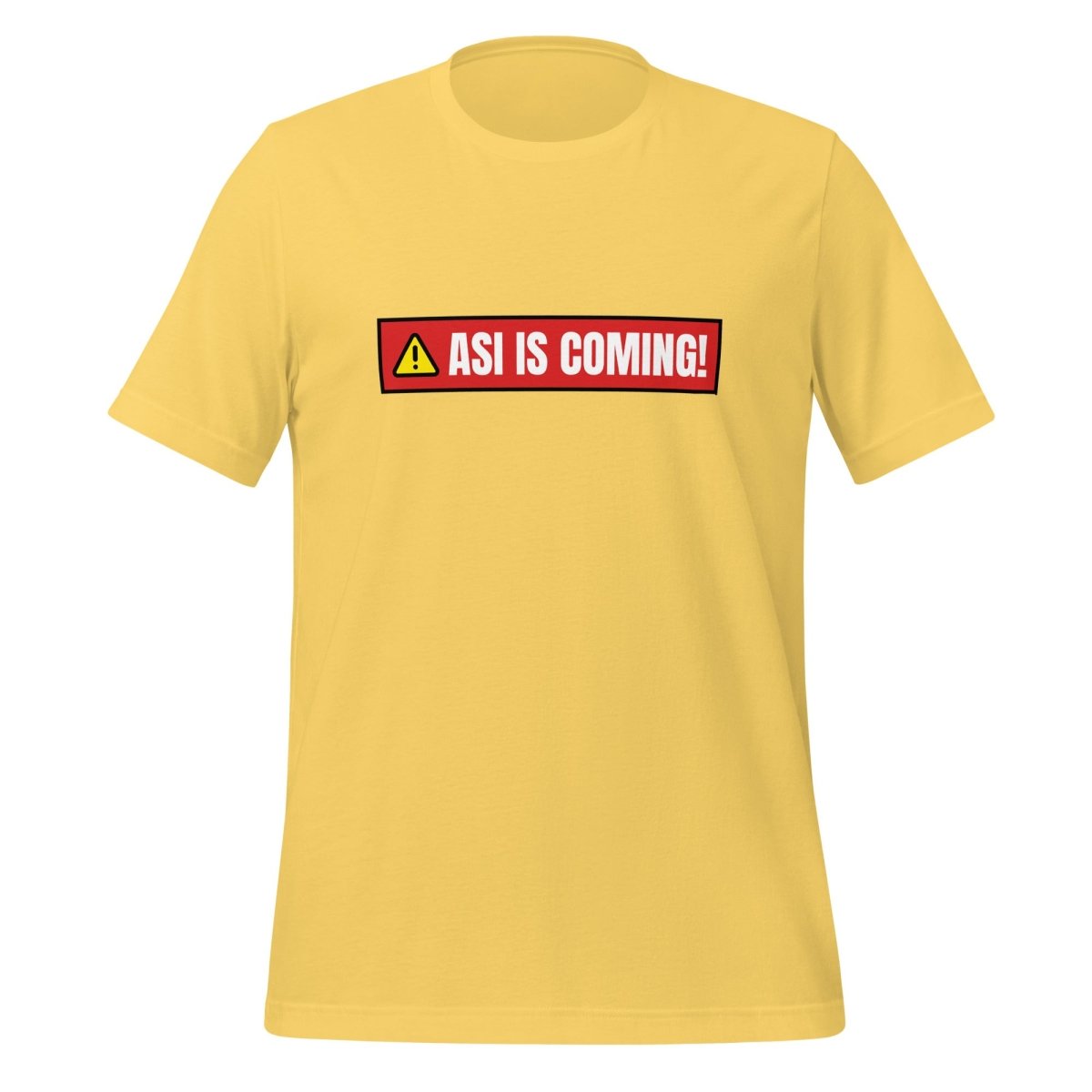 This t-shirt, made with 100% combed and ring-spun cotton, highlights softness, lightweight design, and durability, suitable for a diverse audience interested in technology and future concepts. The design portrays a bold, eye-catching warning sign graphic, emphasizing the theme of artificial superintelligence arrival.