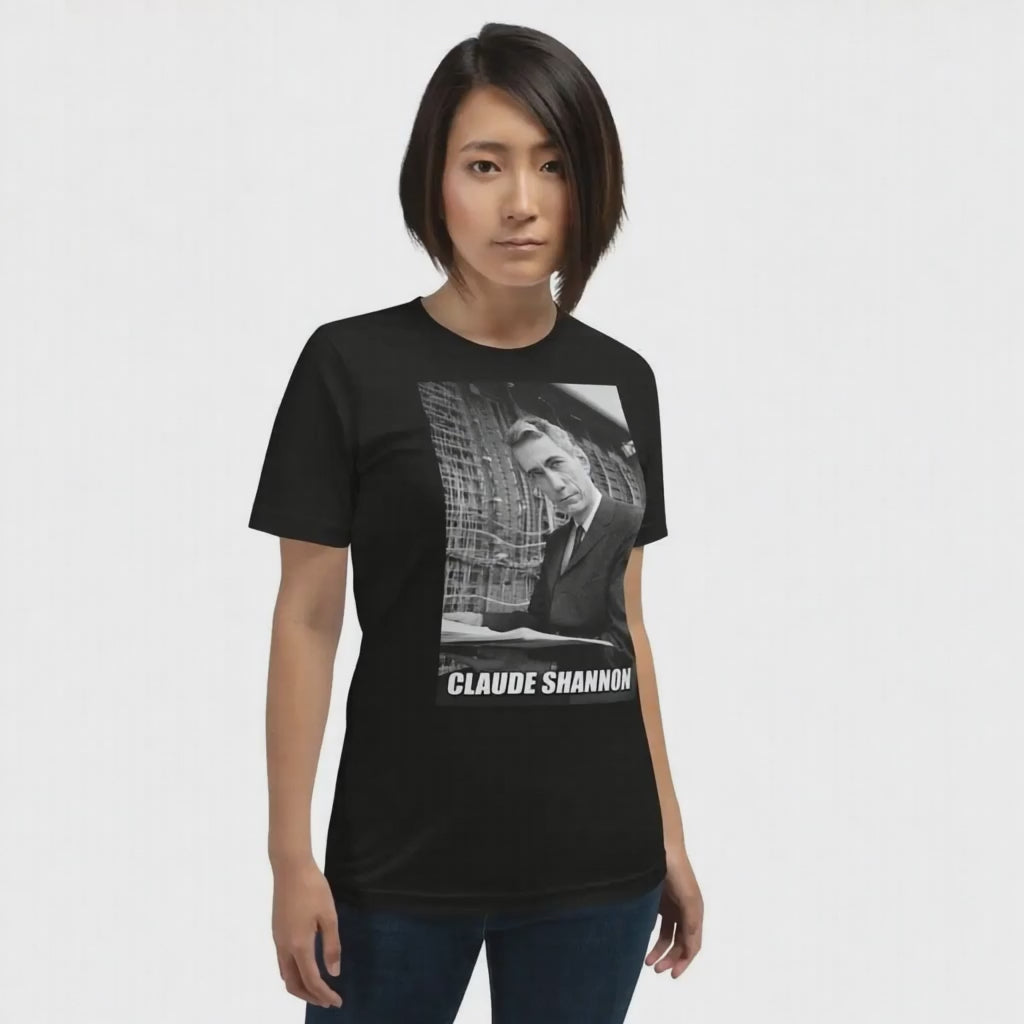 This t-shirt honors Claude Shannon, known as the 'Father of Information Theory,' and is ideal for individuals passionate about technology and history. The shirt features a prominent design with Claude Shannon against a circuit board background, making it both a tribute and a stylish piece.