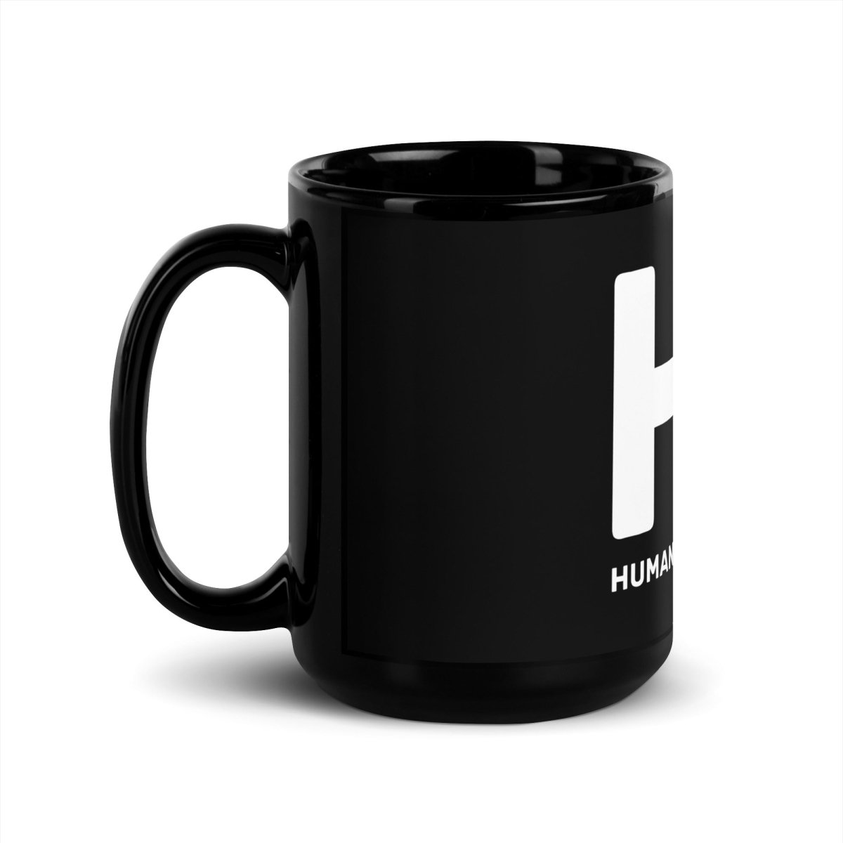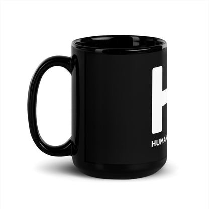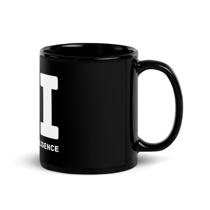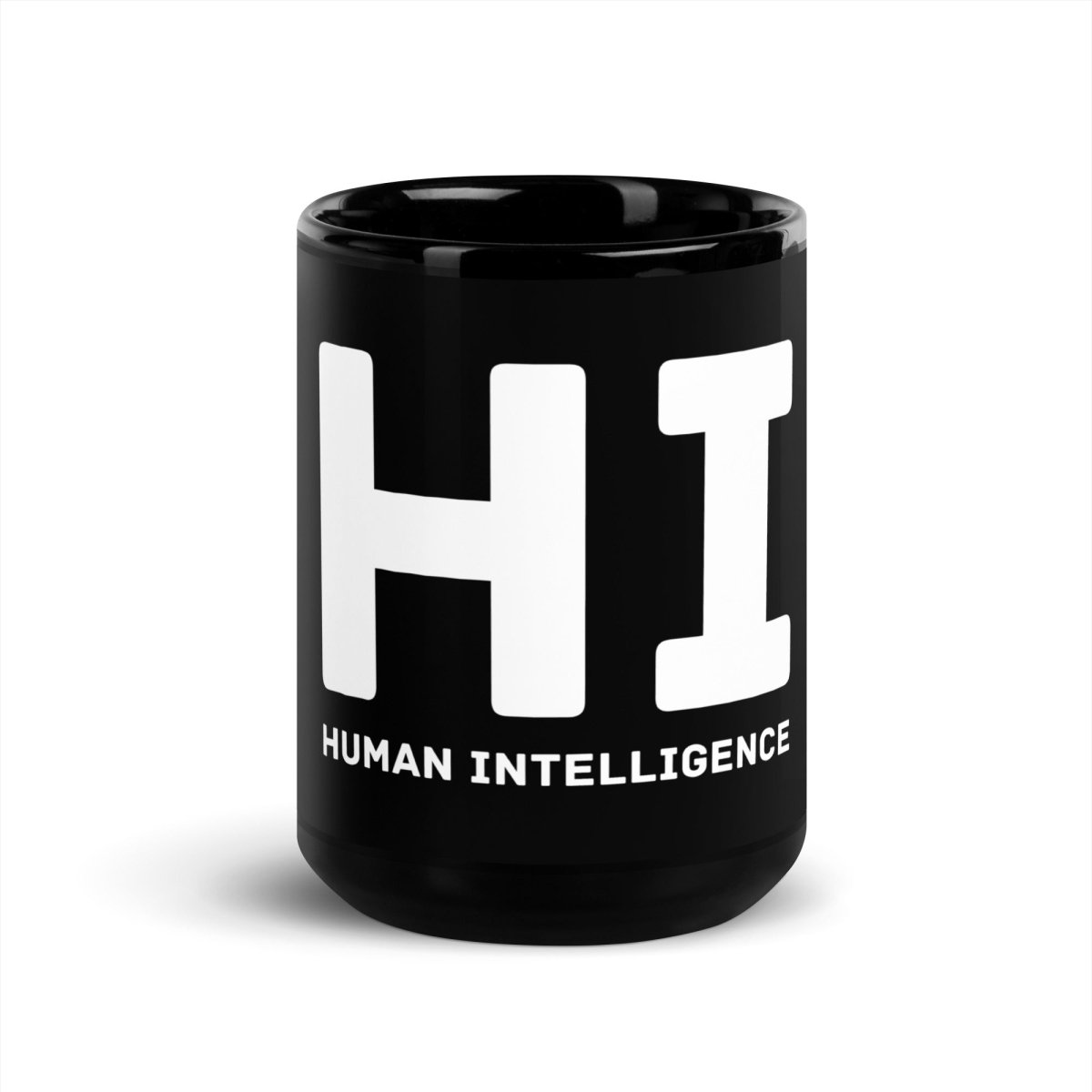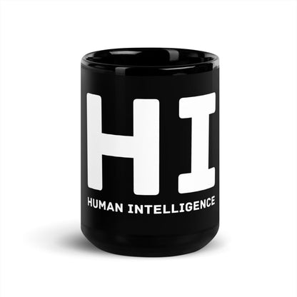 This product is a black glossy ceramic mug featuring the playful acronym HI, representing Human Intelligence. It's designed to add a touch of intellectual flair and geeky charm to any coffee break or desk setup. The mug comes in two sizes, approximately 11 oz and 15 oz, with dimensions suitable for standard drink volumes. The sleek, glossy finish not only enhances its appearance but also makes it a unique statement piece for tech enthusiasts and AI aficionados. It requires hand washing as it is not suitable for dishwasher or microwave use. This mug is ideal for serving coffee, tea, or hot chocolate and serves as a celebration of human cognitive abilities and humor in everyday life. This item is a practical and stylish choice for engaging with the concept of human intelligence in a daily routine, offering both functionality and a conversational piece around the amazing capabilities of humans in a technological world.