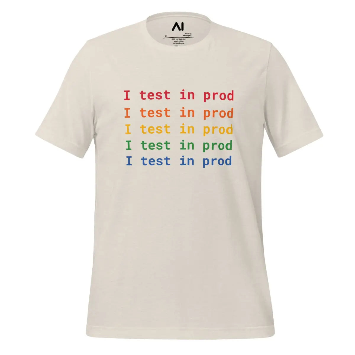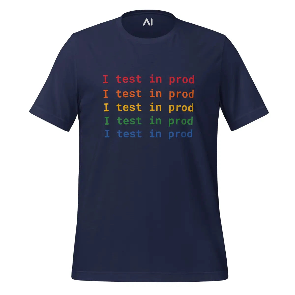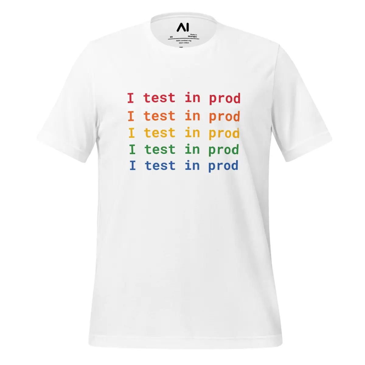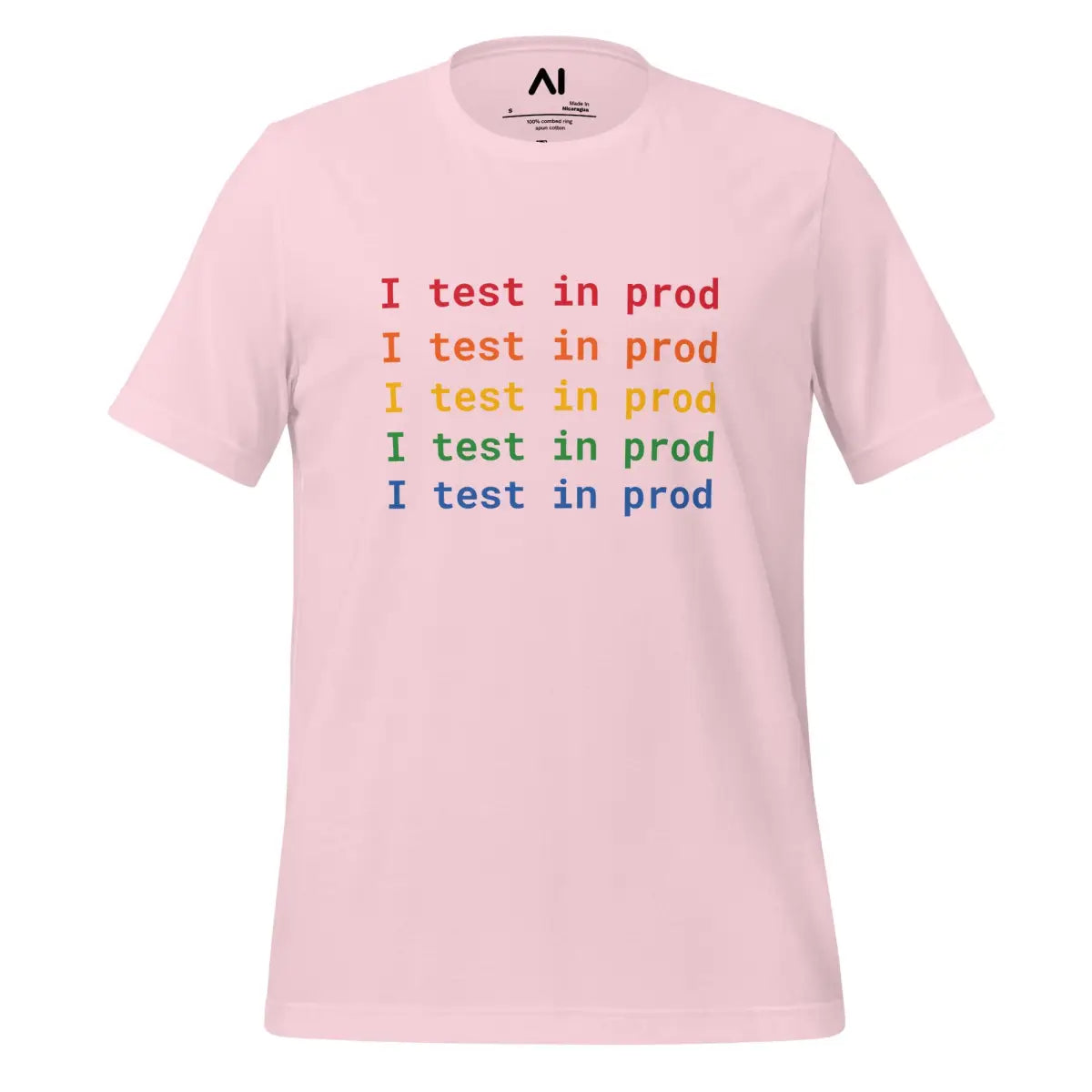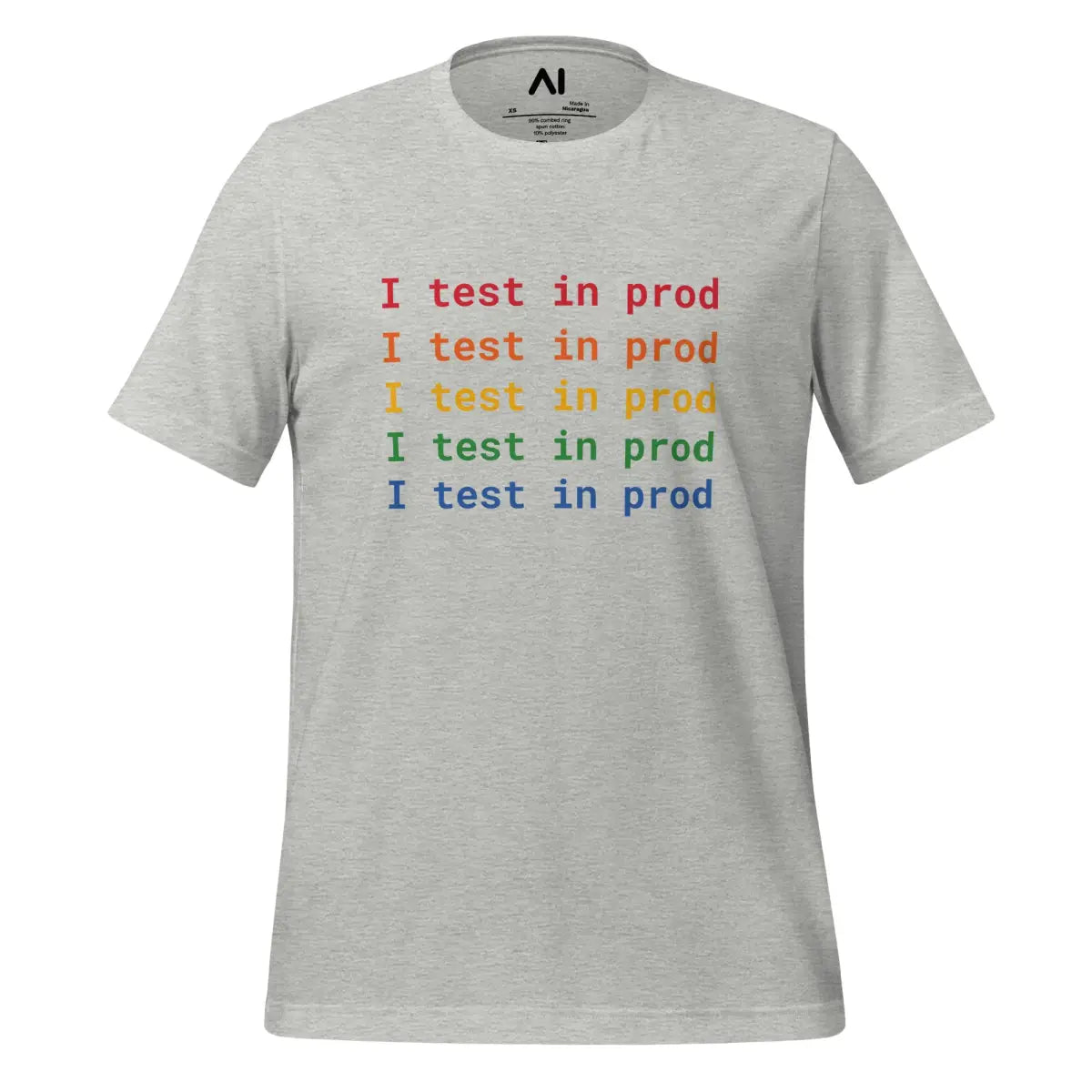 Embrace the playful spirit of software development with the I Test in Prod Rainbow T-Shirt. This unisex t-shirt, appealing with its vibrant rainbow text "I Test in Prod," signifies the thrill of pushing to production. Made from 100% combed and ring-spun cotton with heather variants containing polyester, it offers a soft, lightweight feel with a comfortable stretch. The fabric is pre-shrunk, ensuring consistent size post-wash, and it features a side-seamed construction for durability and shoulder-to-shoulder taping for a better fit.