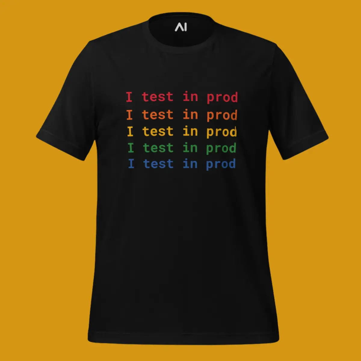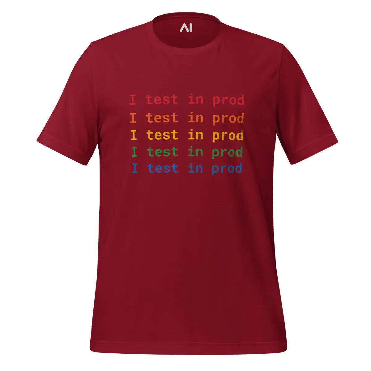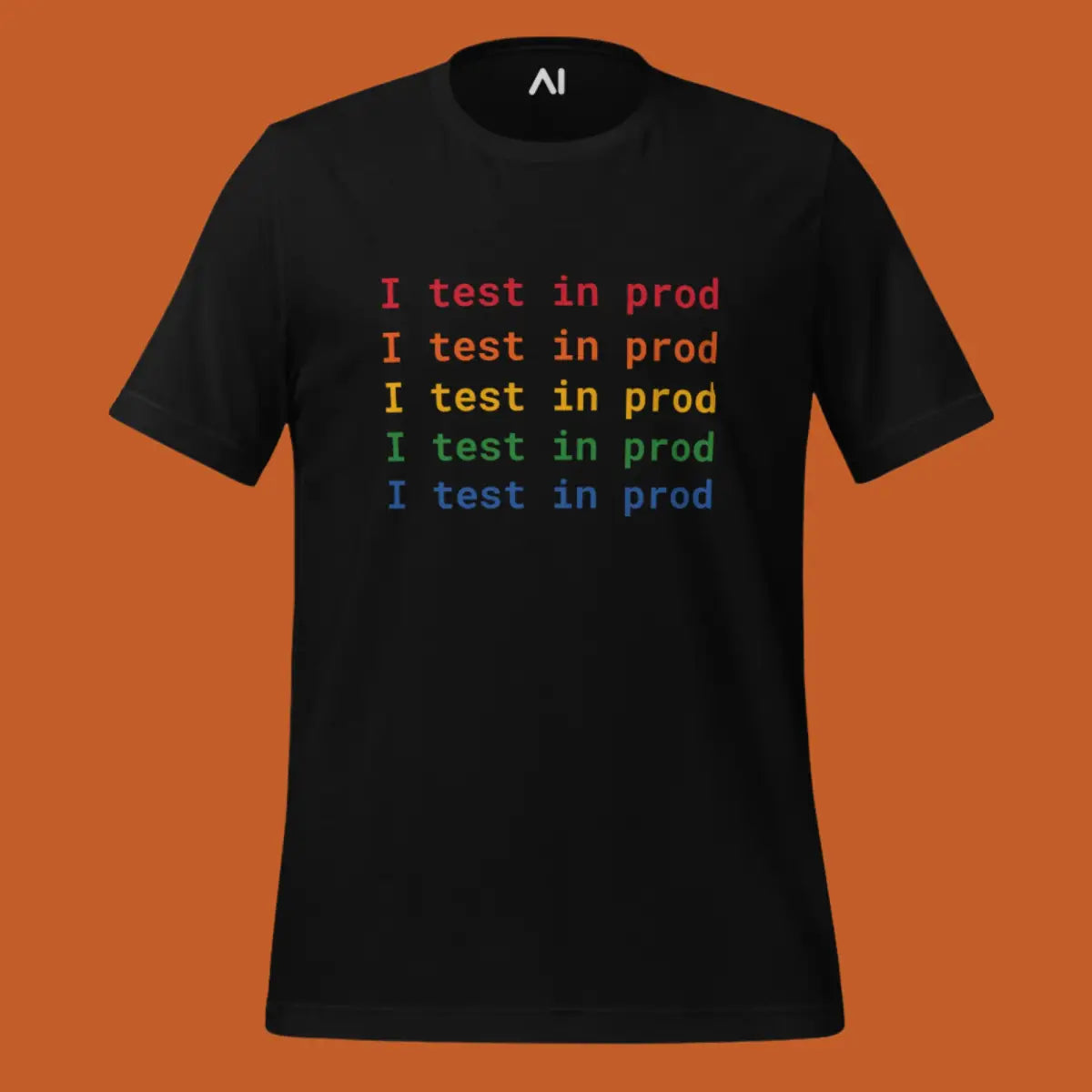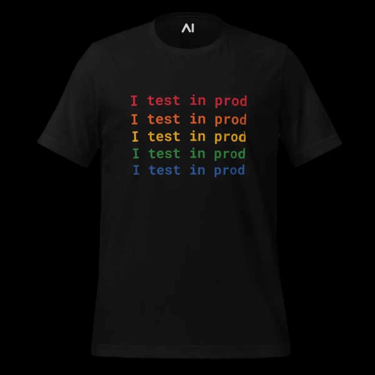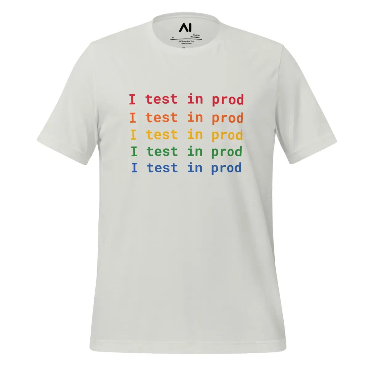 Embrace the playful spirit of software development with the I Test in Prod Rainbow T-Shirt. This unisex t-shirt, appealing with its vibrant rainbow text "I Test in Prod," signifies the thrill of pushing to production. Made from 100% combed and ring-spun cotton with heather variants containing polyester, it offers a soft, lightweight feel with a comfortable stretch. The fabric is pre-shrunk, ensuring consistent size post-wash, and it features a side-seamed construction for durability and shoulder-to-shoulder taping for a better fit.