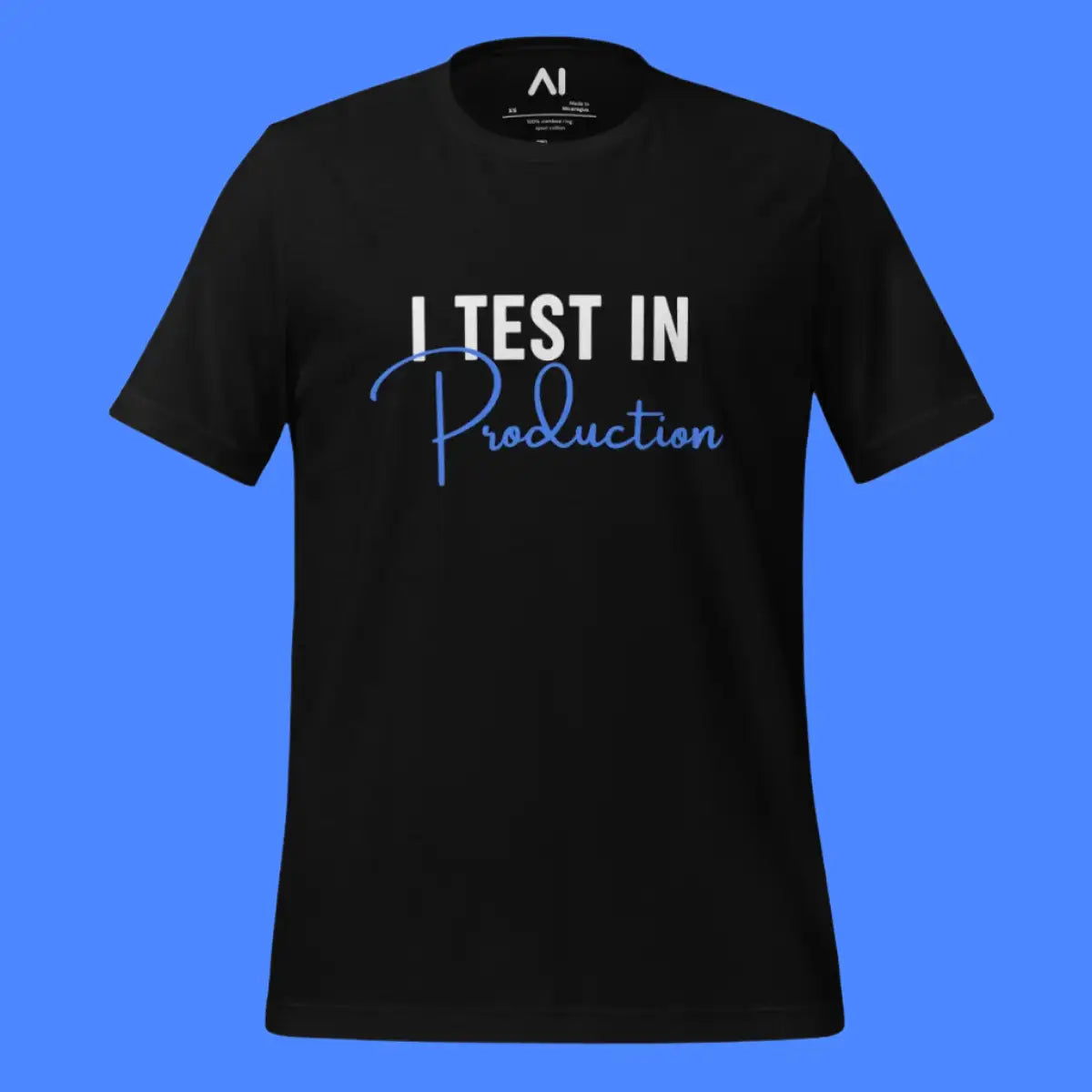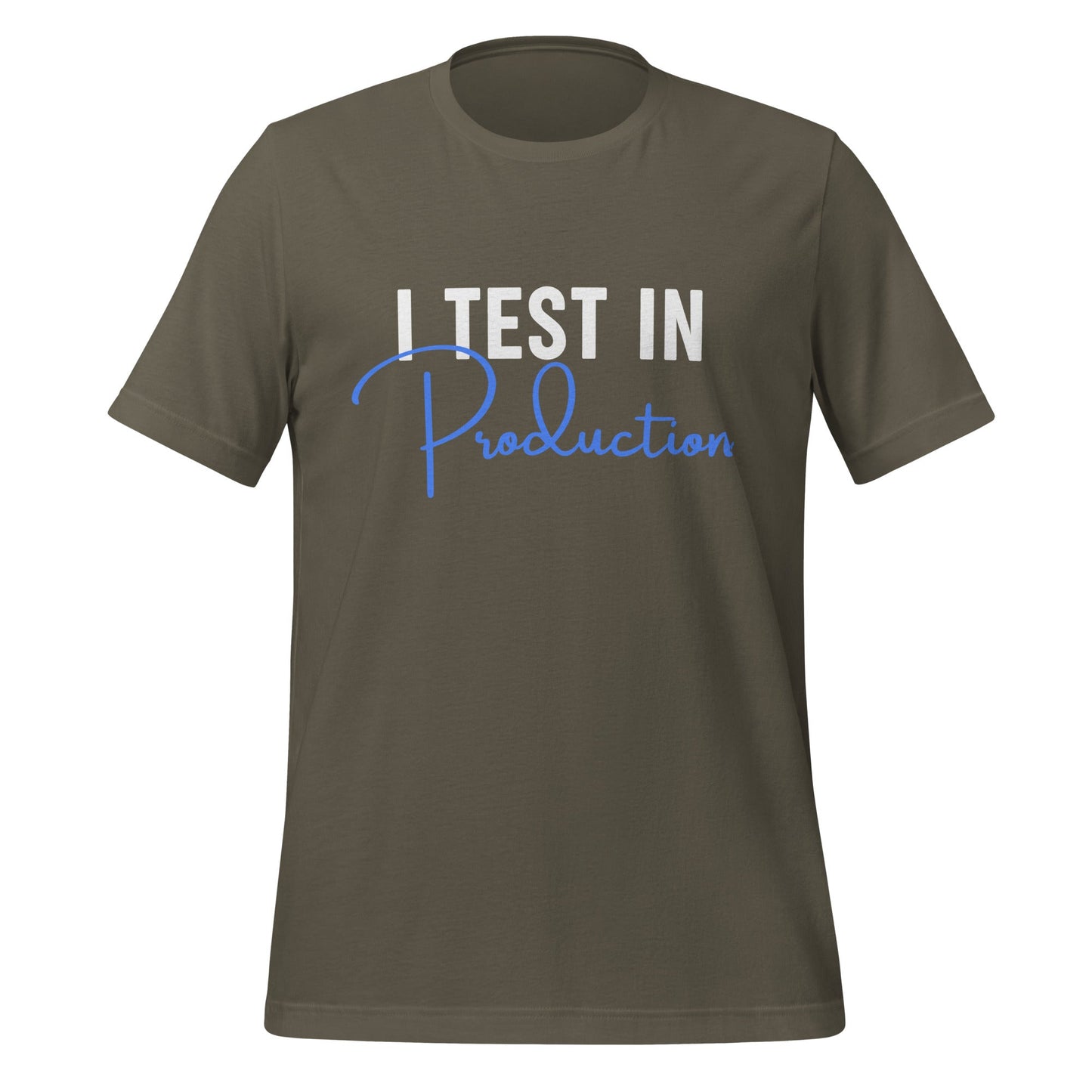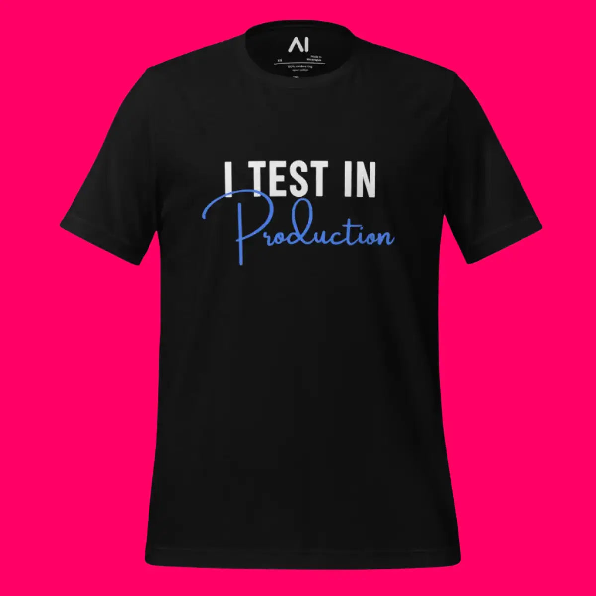 This T-shirt is designed for software enthusiasts who appreciate a touch of humor in their apparel. It features the phrase "I Test in Production," known for sparking conversations and smiles in the tech community. Made with 100% combed and ring-spun cotton, it offers a soft, lightweight feel with the right amount of stretch, ensuring comfort and a flattering fit for all genders.