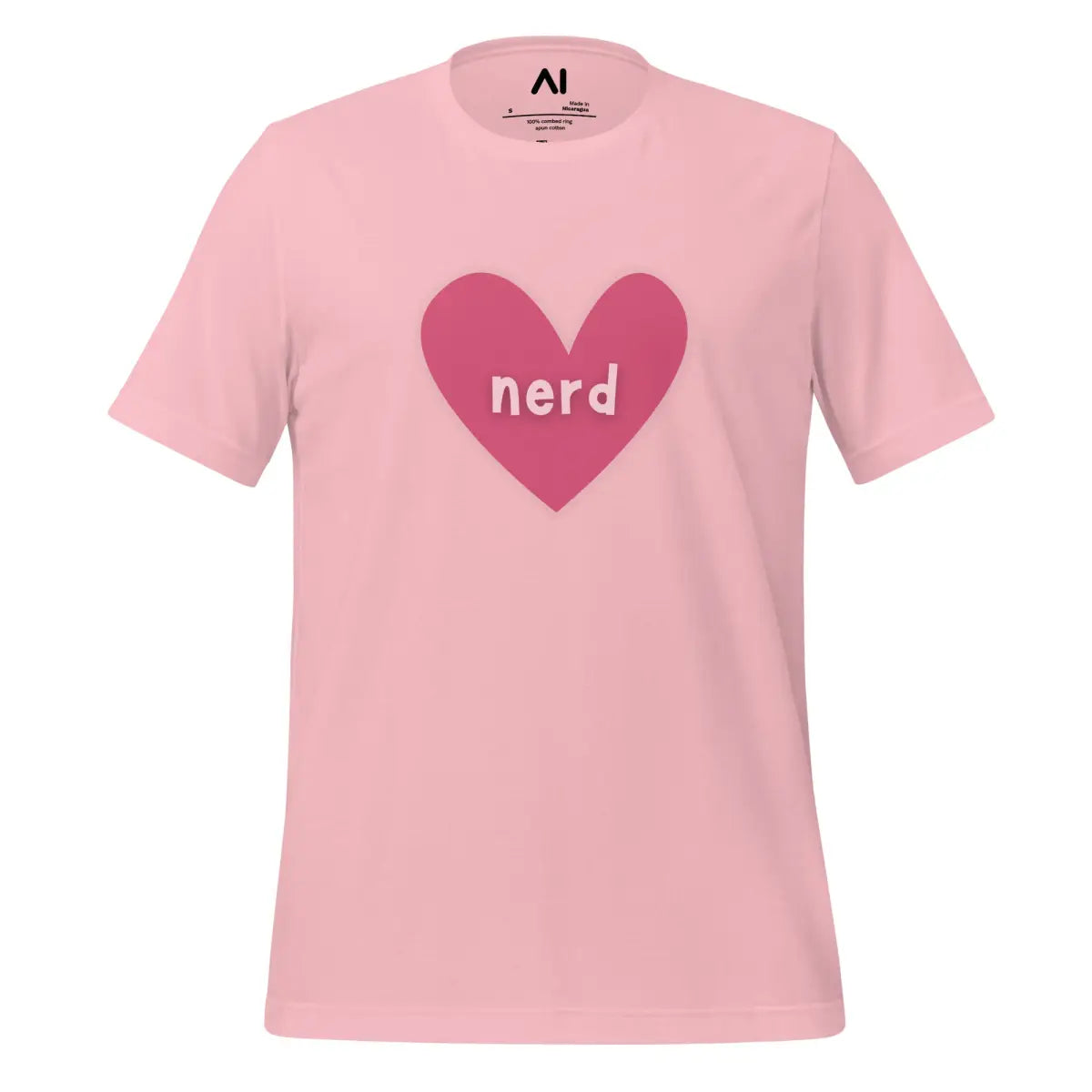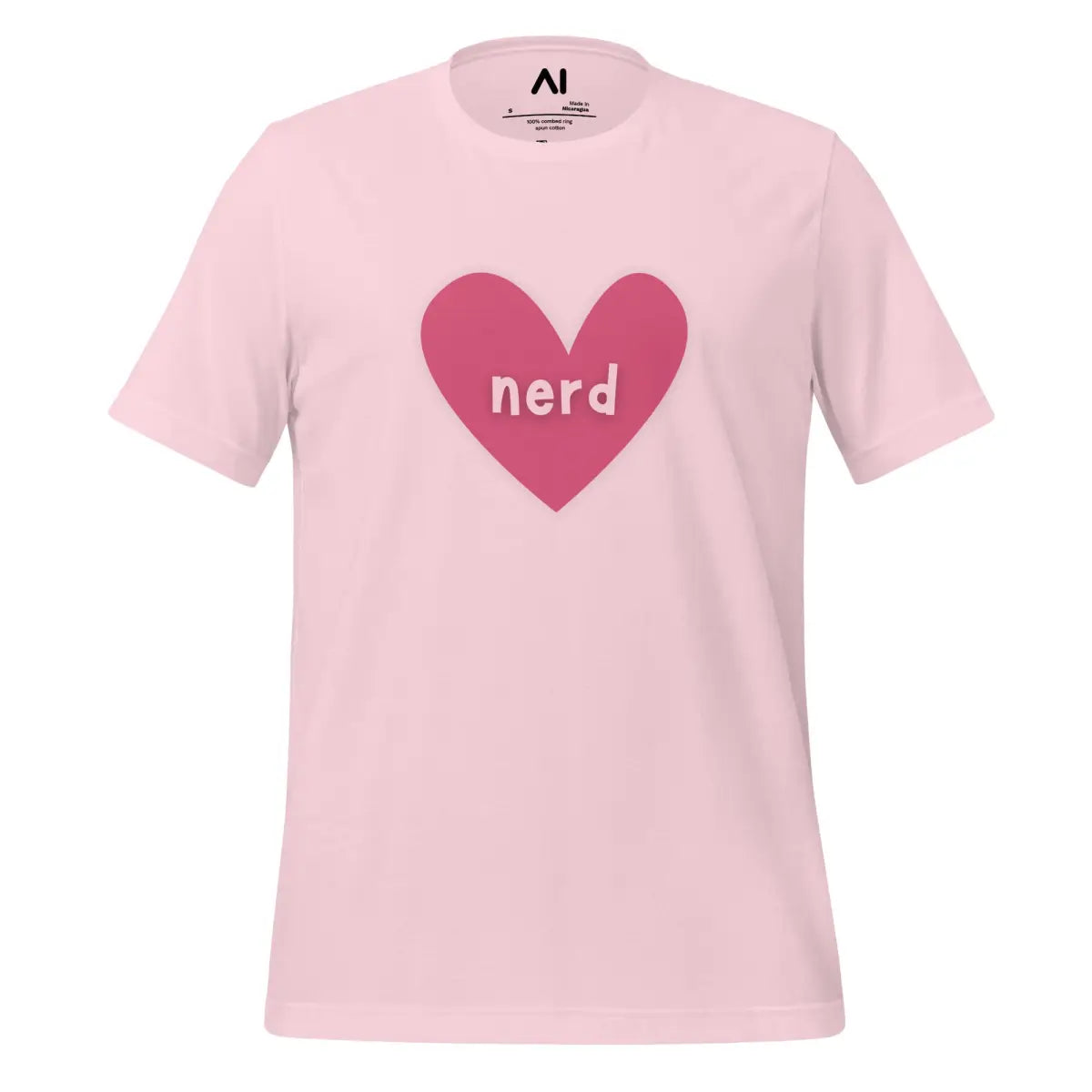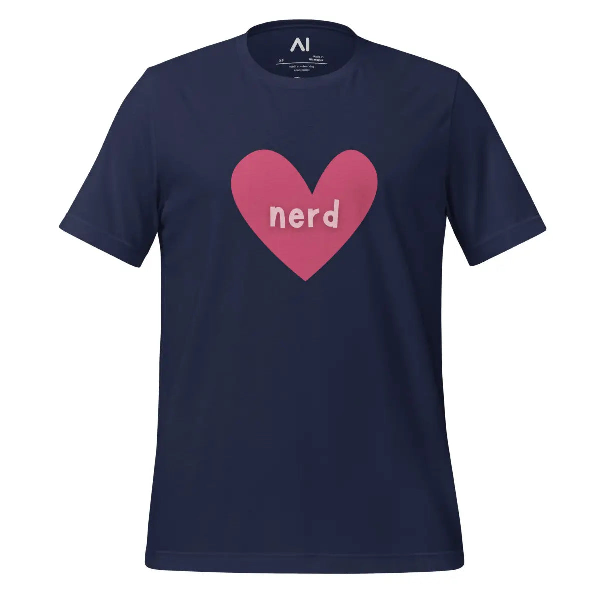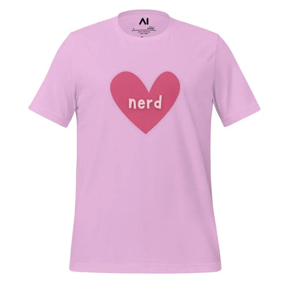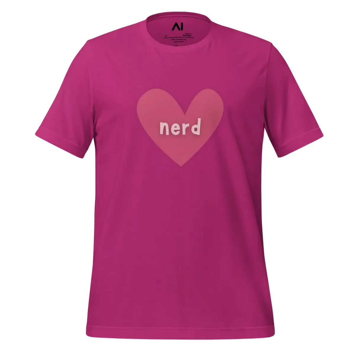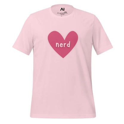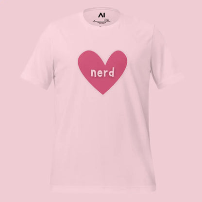- The Love Nerd Heart T-Shirt combines style and comfort, designed for tech enthusiasts with a playful side. Featuring a heart-shaped icon with the word nerd, it symbolizes a love for all things AI and tech. This unisex garment is tailored to fit all body types, making it an inclusive choice for any wardrobe.