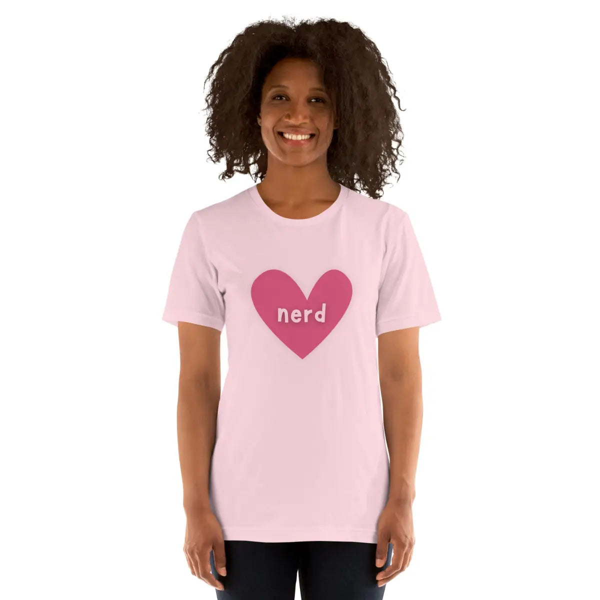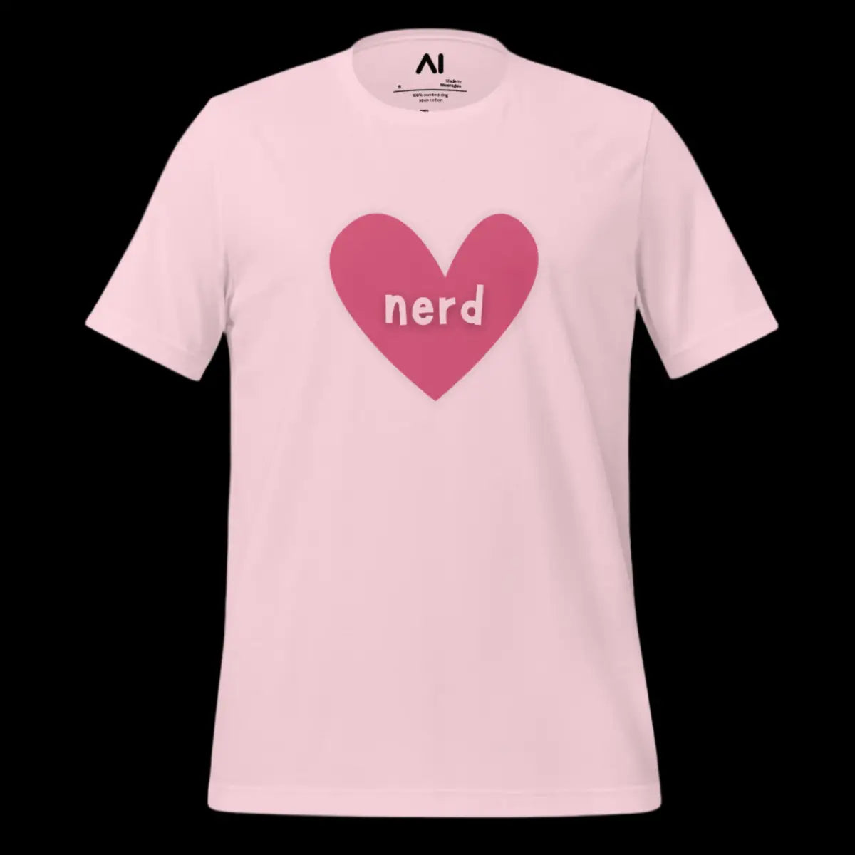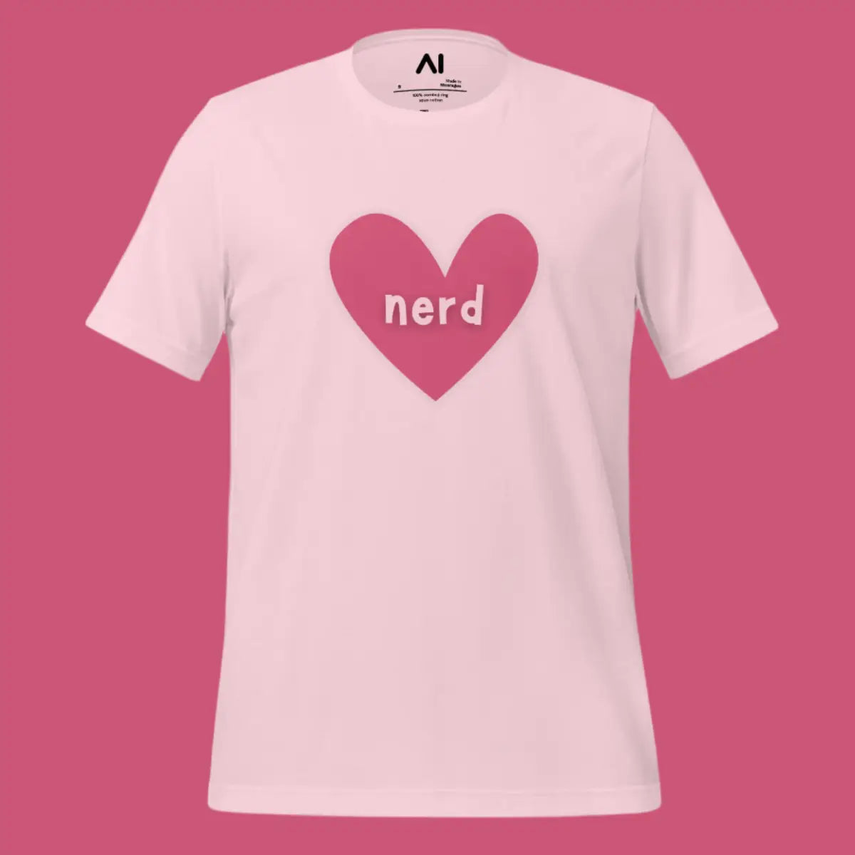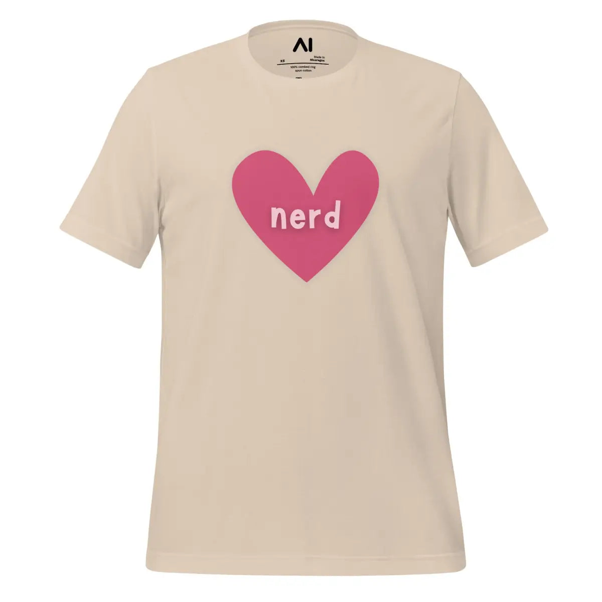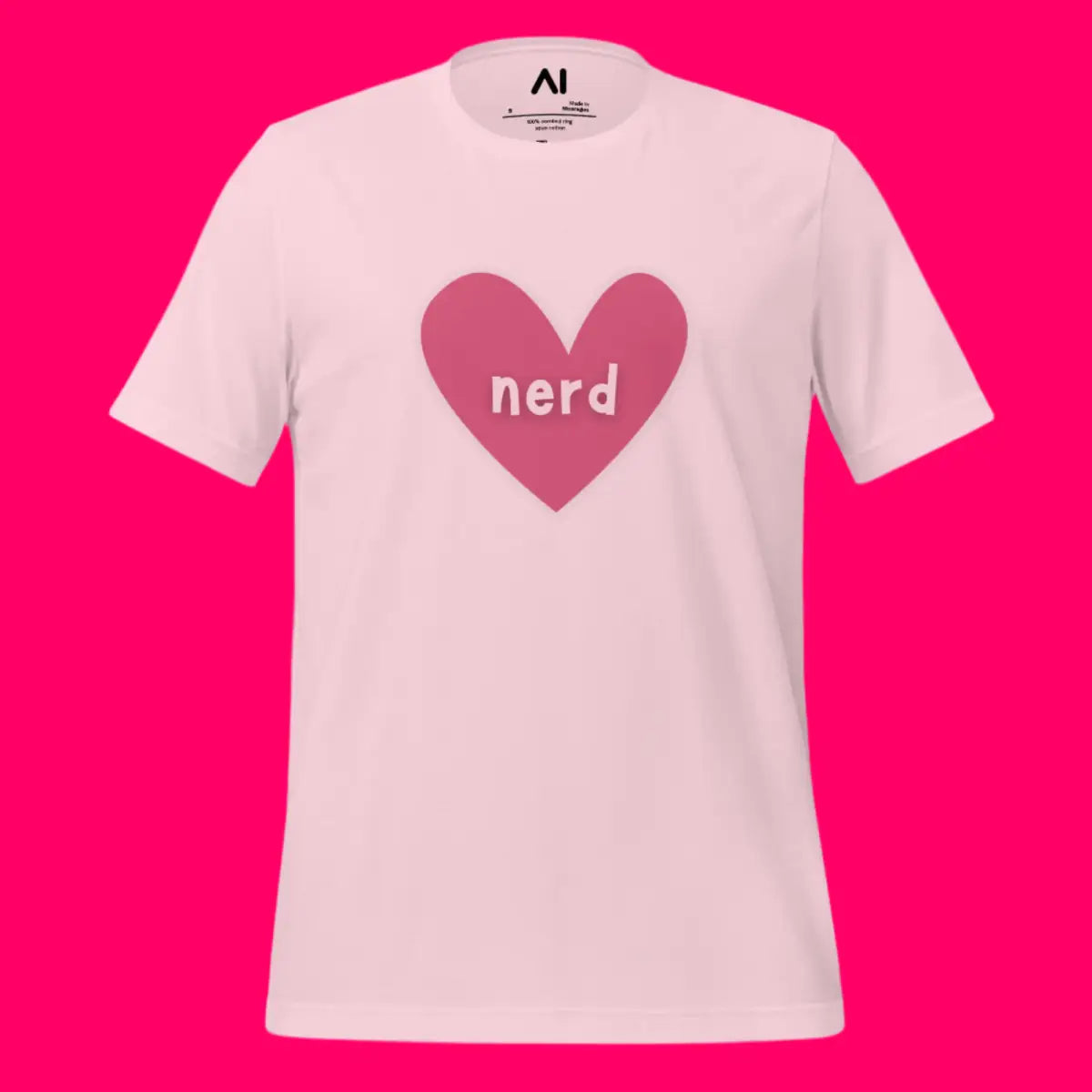 - The Love Nerd Heart T-Shirt combines style and comfort, designed for tech enthusiasts with a playful side. Featuring a heart-shaped icon with the word nerd, it symbolizes a love for all things AI and tech. This unisex garment is tailored to fit all body types, making it an inclusive choice for any wardrobe.