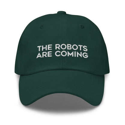 Product Description: Step into the future with The Robots Are Coming Embroidered Cap, a stylish unisex accessory designed for tech enthusiasts and the casually stylish alike. Adorned with an embroidered design epitomizing a playful robotic revolution, this cap not only serves as a fashion statement but also a nod to the burgeoning era of AI and automation. Constructed from high-quality chino cotton twill (with partial polyester composition in the Green Camo variant), this cap promises both comfort and durability. Its unstructured, 6-panel, low-profile design with six embroidered eyelets and a curved visor ensures a classic, comfortable fit. An adjustable strap with an antique buckle allows for customizable sizing, catering to a broad audience.