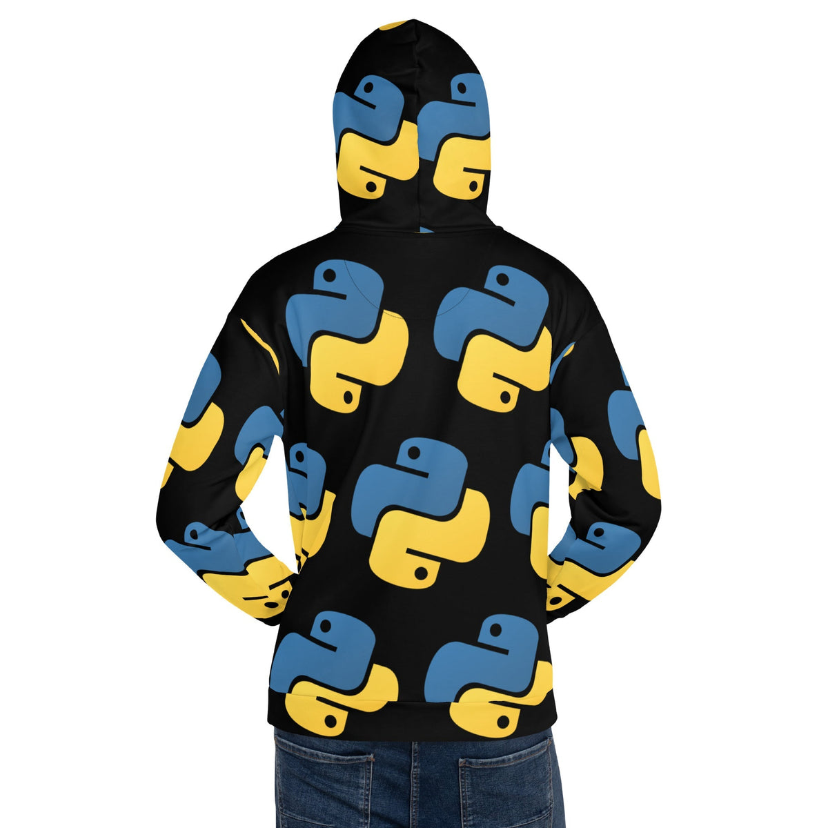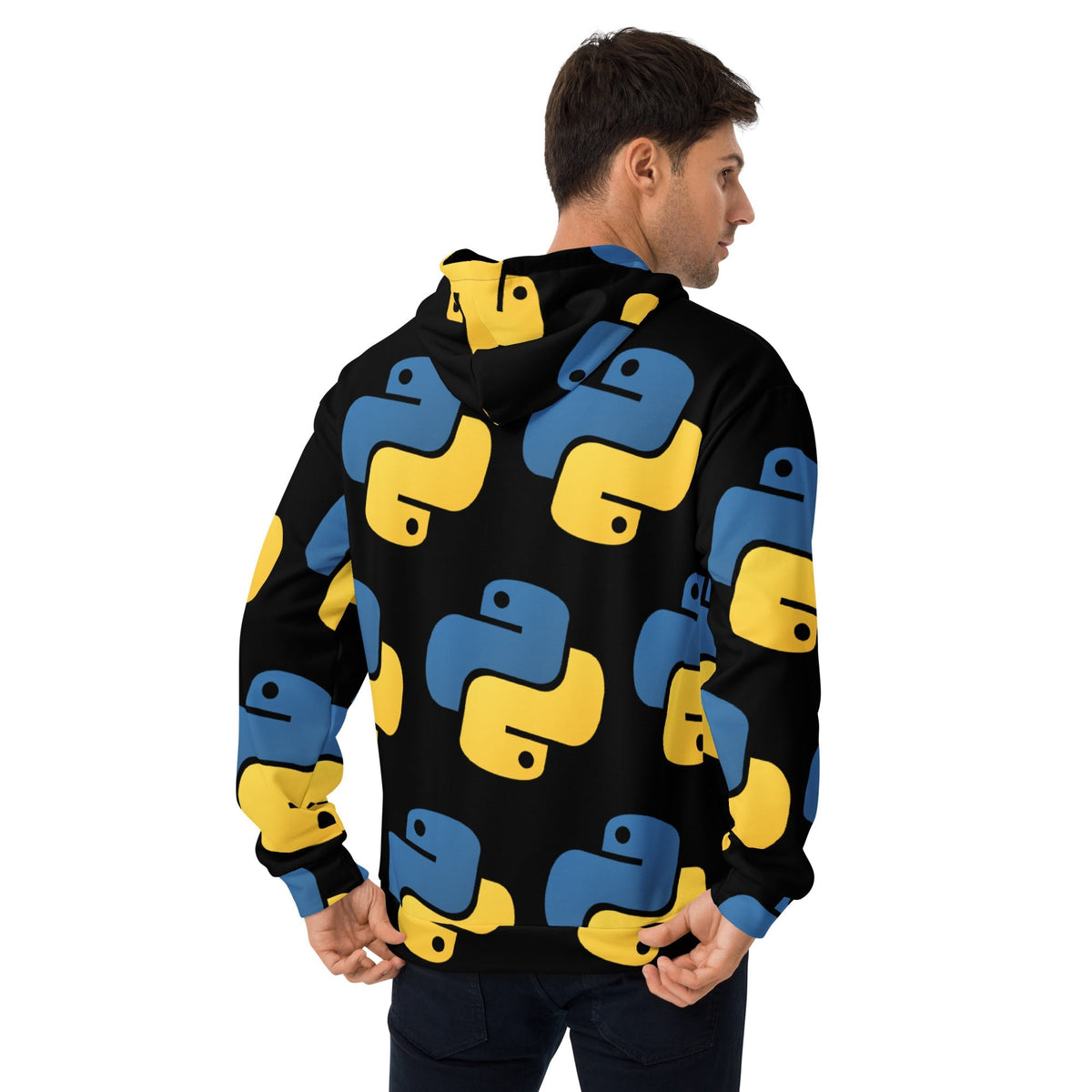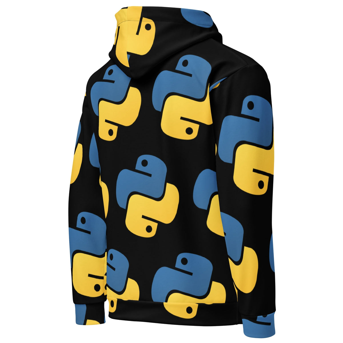 The hoodie is characterized by its vibrant, all-over print of the Python logo, making it not only a garment but a statement piece for those in the know about programming languages and AI.
