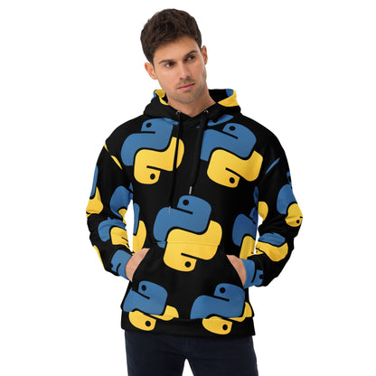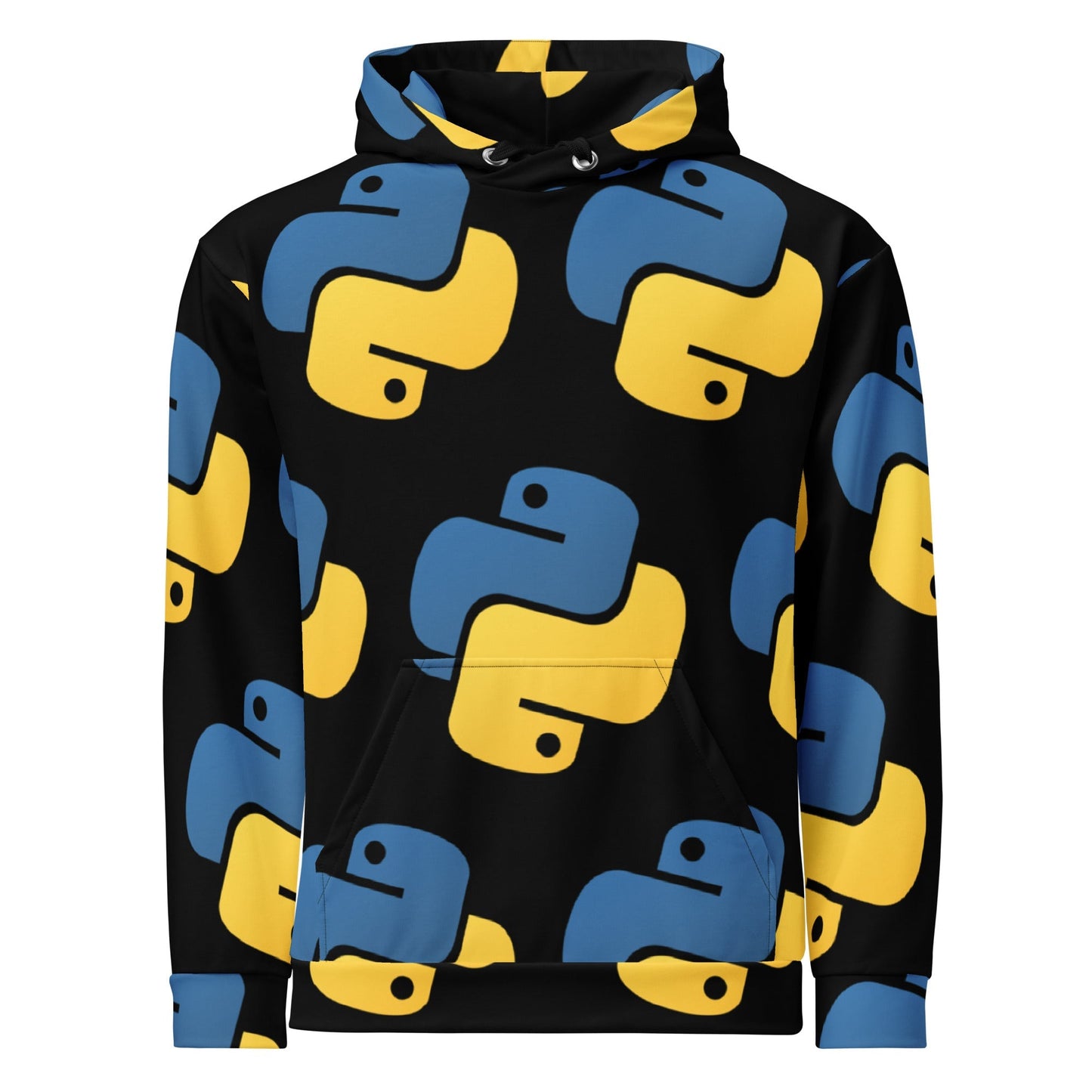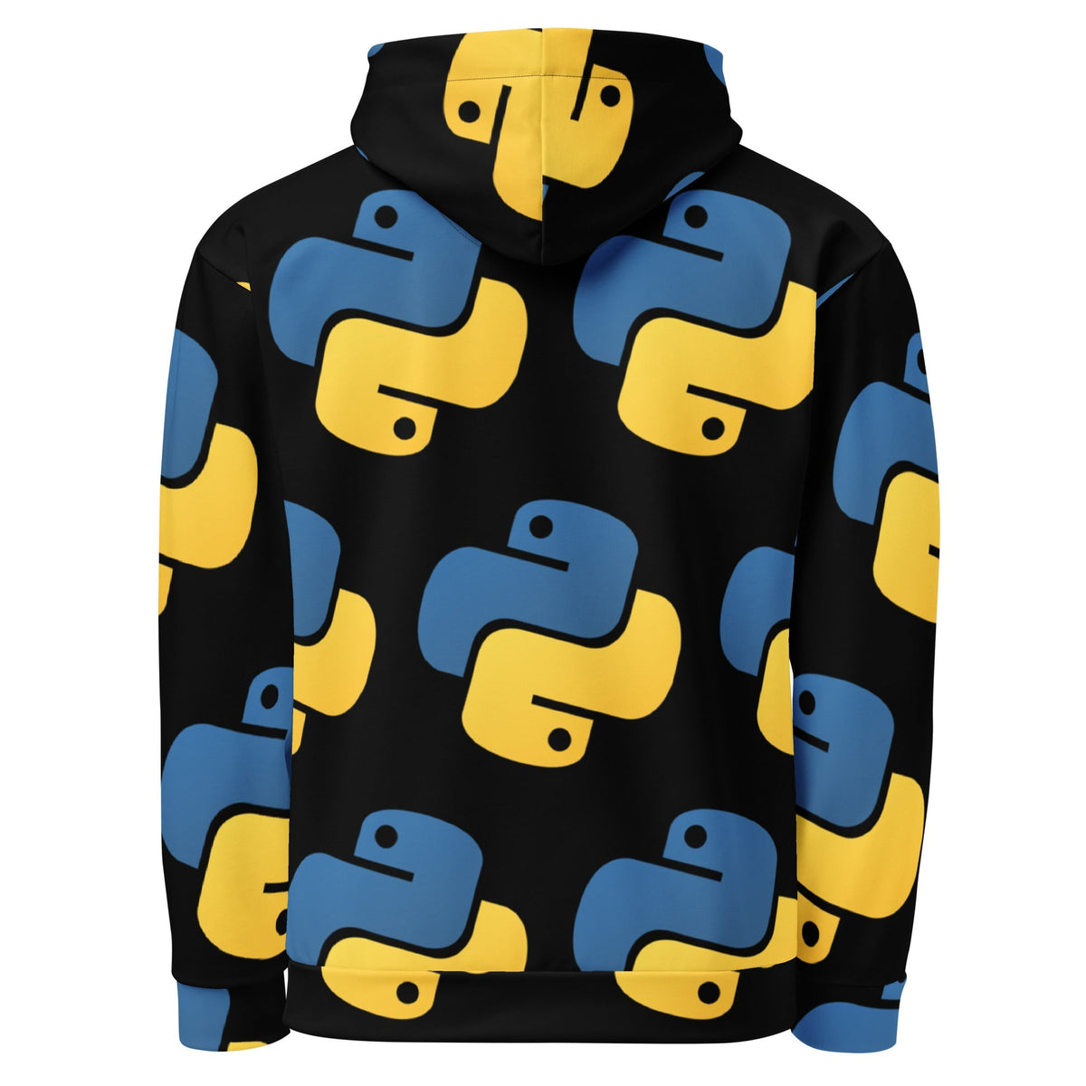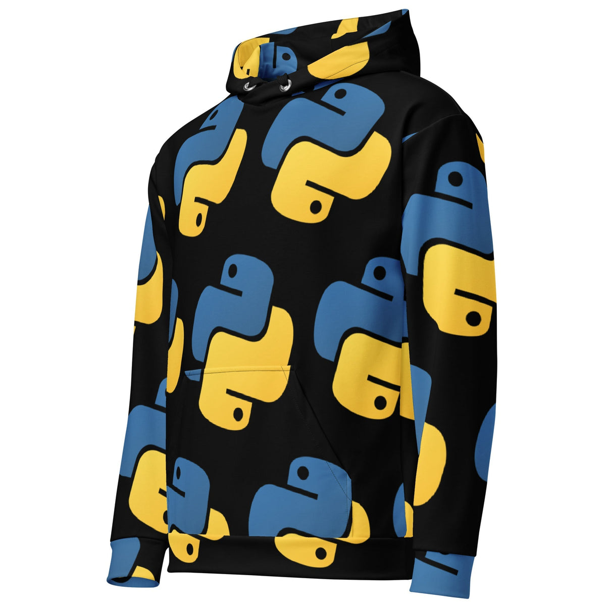 The hoodie is characterized by its vibrant, all-over print of the Python logo, making it not only a garment but a statement piece for those in the know about programming languages and AI.