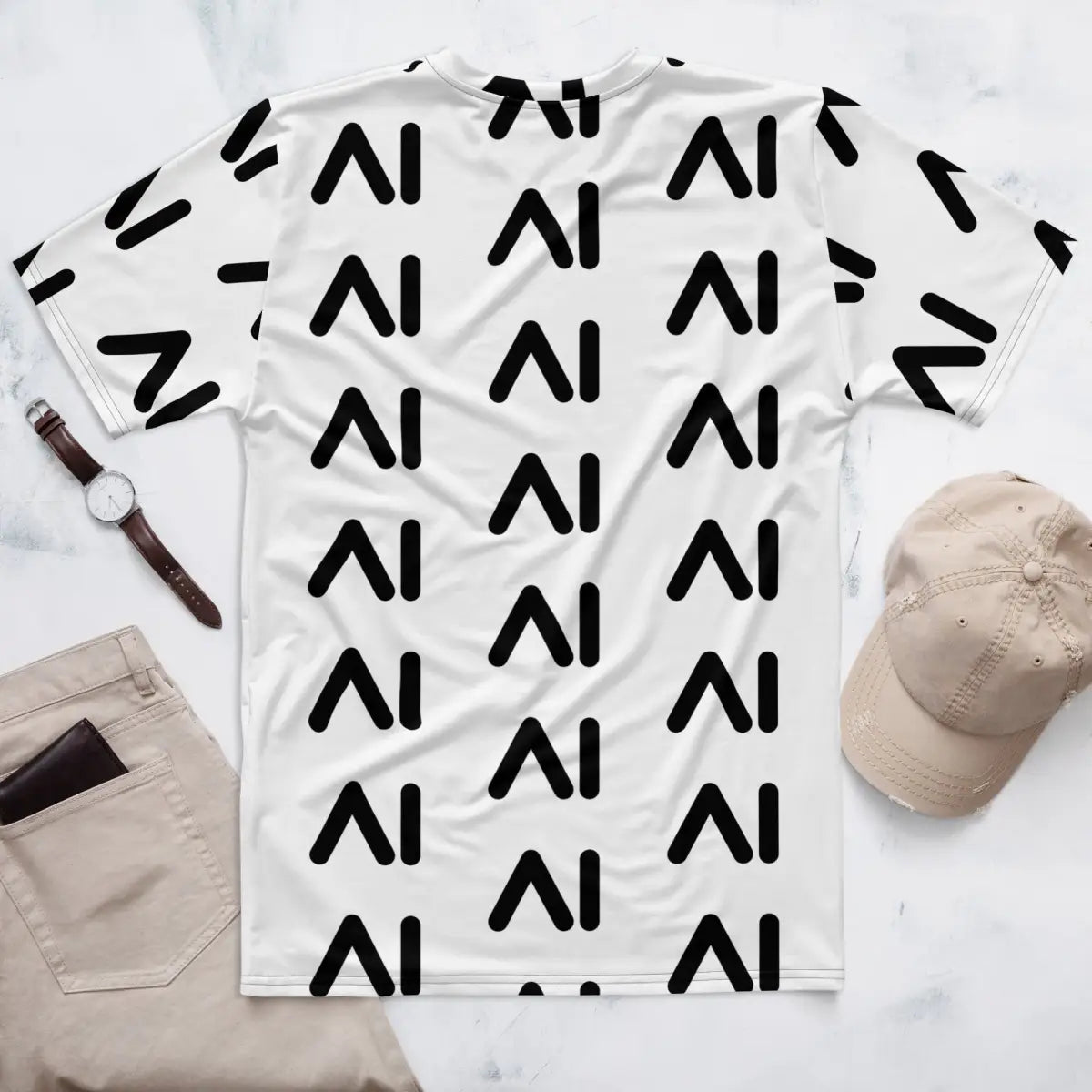Featuring a crisp AI logo pattern on a white backdrop, this men's t-shirt combines comfort with a tech-centric design, making it a perfect fit for anyone passionate about artificial intelligence or looking for a tech-savvy wardrobe addition. The fabric blend varies slightly by region, ensuring optimal print impact and high durability suitable for wear in various environments.